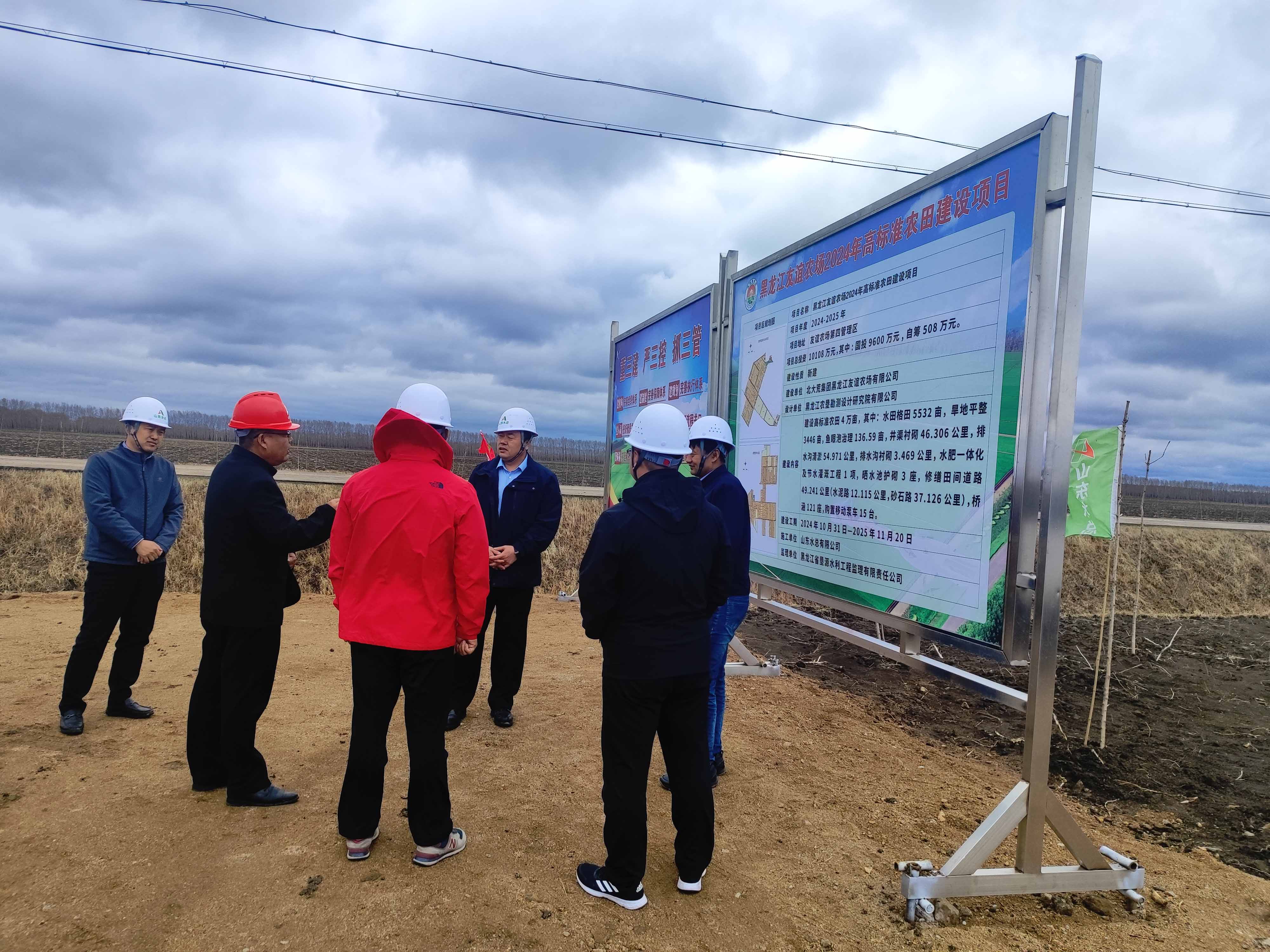 裴文晶一行首先来到黑龙江省粮食产能提升项目了解项目进展,并同项目部一线人员进行交流。随后,调研组来到黑龙江友谊农场2024年高标准农田建设项目,同北大荒集团黑龙江友谊农场有限公司副总经理樊庆华进行会谈。双方对当前项目的总体进度、面临的机遇和挑战进行了分析和研讨,并对下一步如何加强合作进行深入交流,展望两家省级国有企业合作的未来,努力发挥山东水总基础建设和北大荒集团农业生产运营的优势,打造出“1+1>2”的效果。